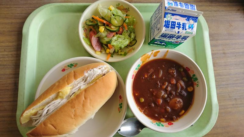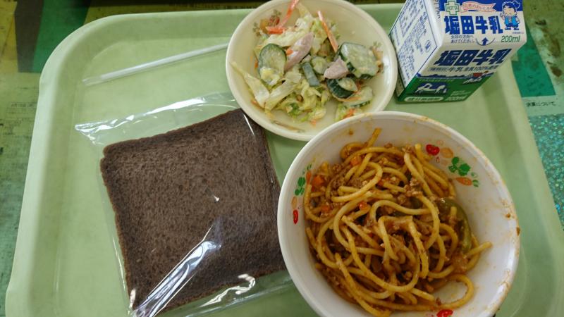 今日の献立は、ココアパン、スパゲティミートソース、アーモンドサラダでした。子どもたちの大好きなスパゲティミートソース。本日もおかわりの長蛇の列が各クラスで見られました。1年生はおかわりもすぐに売り切れ、数名の人は先生から少し分けてもらいました(;^_^A食欲満点