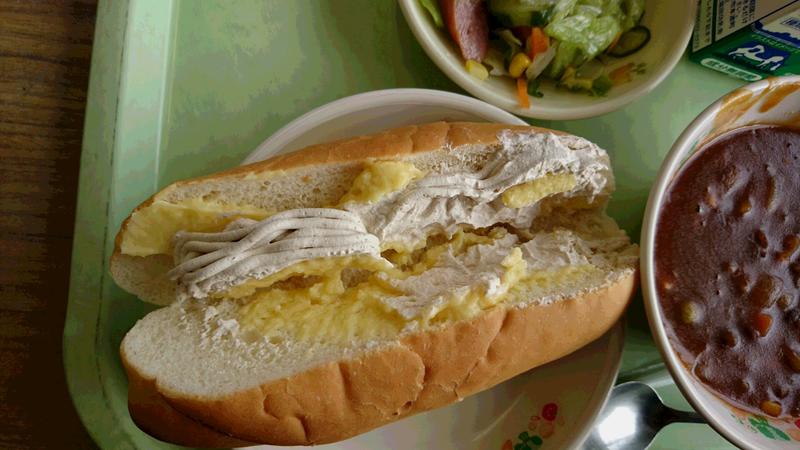 今日の献立は、モンブランパン、ビーフシチュー、オレンジサラダでした。初登場のモンブランパンは、2種類の栗のクリームがはさんであります。①給食室手づくりの、卵、牛乳、砂糖、コーンスターチ、マロンペースト、バターを練った栗のクリーム と ②冷凍のモンブランホイップ です。絞り袋に入ったモンブランホイップは、口金に小さな穴がたくさん空いていて、ケーキのモンブランのように絞り出されました。子どもたちからとても好評でした。