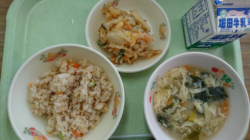 今日の献立は、三色そぼろごはん、新玉ねぎのかき揚げ、五目汁でした。手作りのかき揚げは学年ごとに大きさを変えながら計230個揚げました。新玉ねぎの甘みがよく出ていました。揚げるときにばらけてしまった野菜の破片もおまけに出してあげるときれいに平らげてくれました。