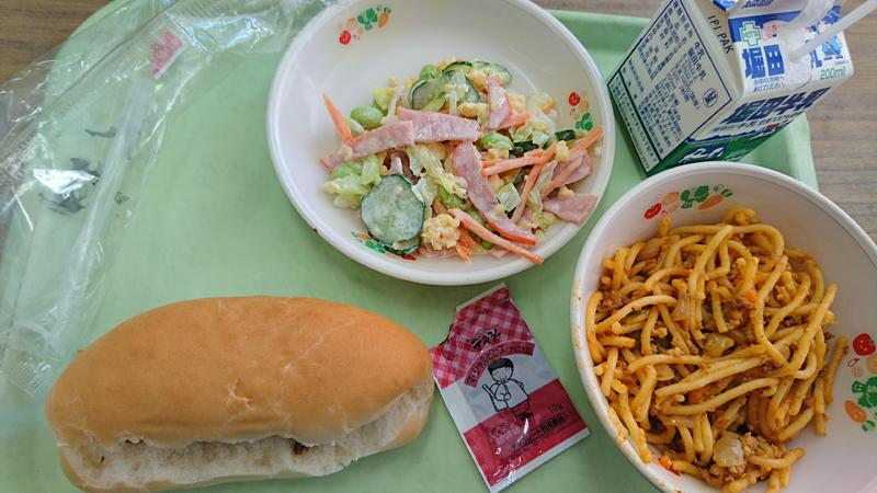 パリパリ焼きそばは、ここ数年実施していなかった珍しいメニューで写真の通り、一人分ずつ小袋に麺が入っています。この麺をあんかけの入った椀に入れて食べるという、本来のものとは逆の作業になります。「上から麺をのせてあんとからめる」この作業が結構難しく、、苦労しながら食べていた子どもたちもちらほらと見られました(;^ω^)