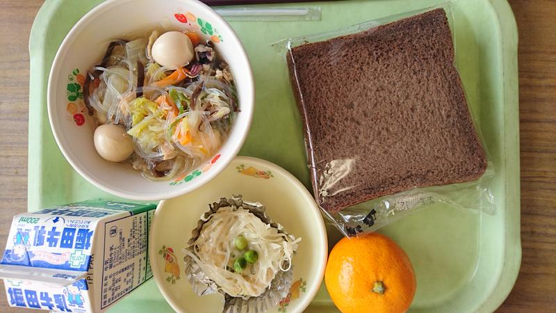 今日の献立は、肉まん(低、中学年は小籠包)、ソースビーフン、フルーツヨーグルトでした。コンビニサイズの肉まんはとても食べごたえがありました。1年生の中には「小籠包を初めて食べました!」という子どもたちも多数いました。かぶりつくと肉汁があふれてきておいしそうでした。