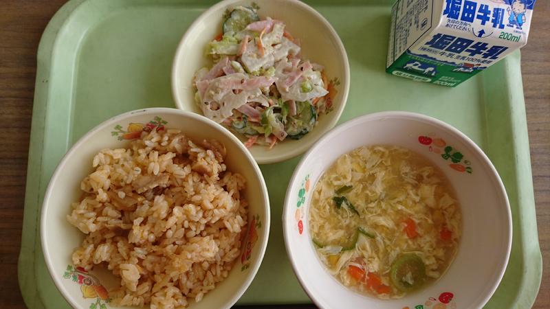 今日の献立は、キムチごはん、れんこんサラダ、たまごスープでした。まぜごはん人気ナンバーワンのキムチごはん、1年生の子どもたちはおかわりの大行列ができていました。具は、豚バラとしょうがを炒めてキムチ(和風キムチが合います)とごまを加えて、砂糖、濃口醤油、酒、塩で調味します。これをごはんに混ぜて出来上がりです。ご家庭でもお試しください。サラダのれんこんもシャキシャキさくさくでとってもおいしかったです。