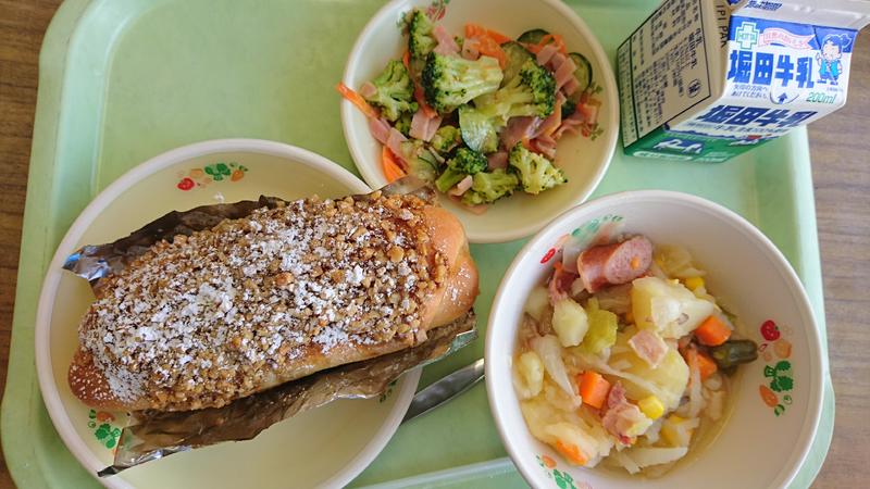 今日の献立は、シュトーレン、切り干し大根のポトフ、ブロッコリサラダでした。毎年恒例のクリスマスメニュー「シュトーレン」はドイツのクリスマス菓子です。給食ではコッペパンにマーガリンと黒糖、ナッツをねったものを塗って焼き、粉糖をふりかけました。本物は生地にナッツやドライフルーツが練り込んであり、硬く焼き上げてずっしりとしてます。クリスマスの2週間くらい前に用意して、一日一日クリスマスが近づくのを感じながら、薄くスライスして食べるそうです。(↓↓大きな口でパクっ!)