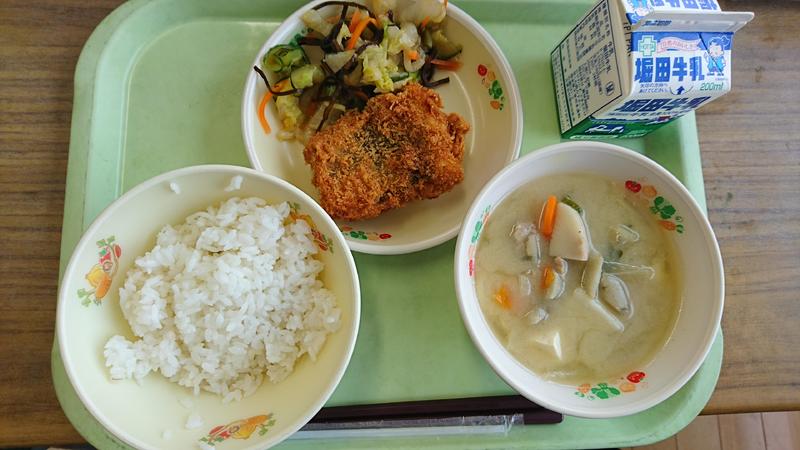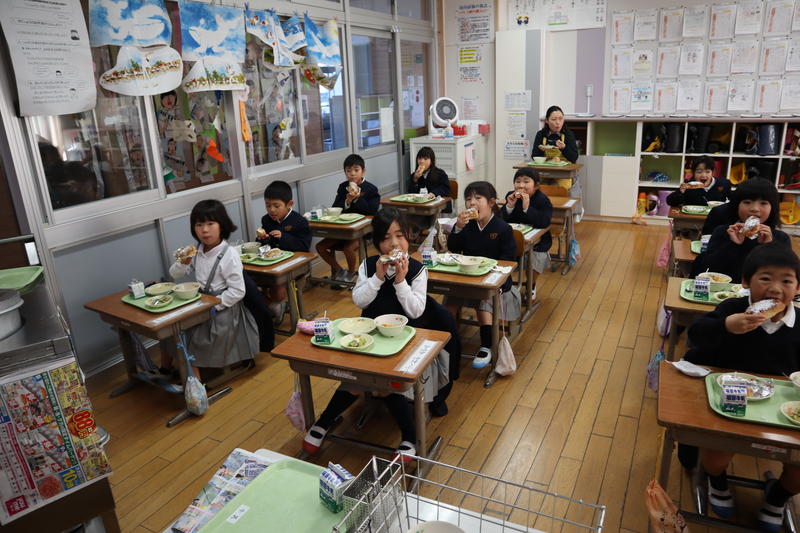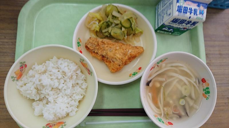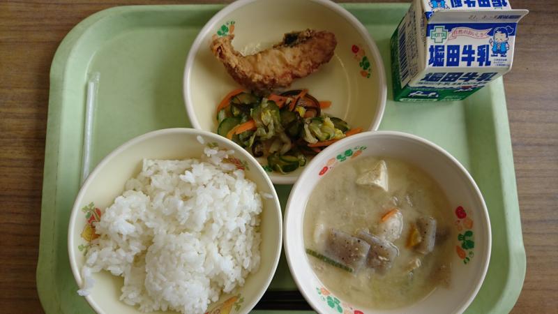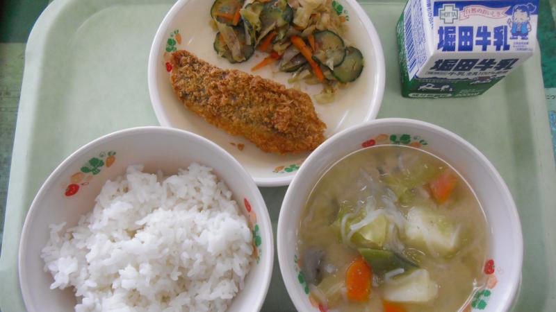 今日の献立は、ごはん、天草産スズキのフライ、かつおあえ、春野菜の豚汁でした。食欲旺盛な1年生の子どもたちは毎日給食を楽しみにしてくれています。今日も、「魚(スズキ)フライと豚汁」と聞くと「やったぁー!」と歓声が上がっていました。