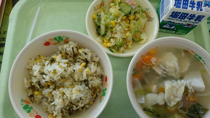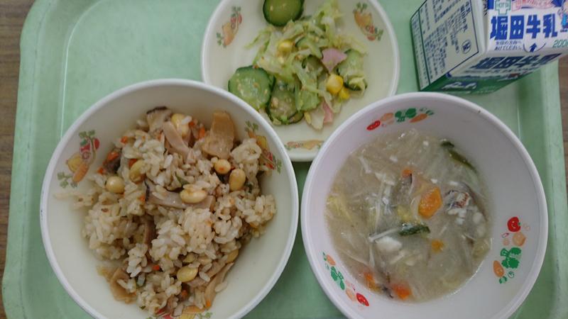 今日の献立は、大豆の香味ごはん、多菜包子、中華きゅうり、わかめスープでした。本日は中華メニュー、大豆たっぷりの混ぜご飯はオイスターソース味です。初登場の多菜包子は餃子に似た感じで、子どもたちにも人気でした。