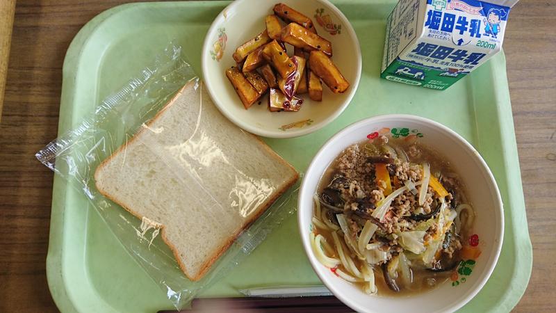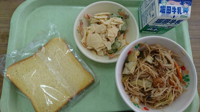 今日の献立は、米粉パン、ミックスうどん、和風サラダ、ヨーグルトでした。米粉パンは、米の消費拡大を目的として、平成21年から学校給食に導入されました。小麦粉のパンよりももちもちとした食感です。