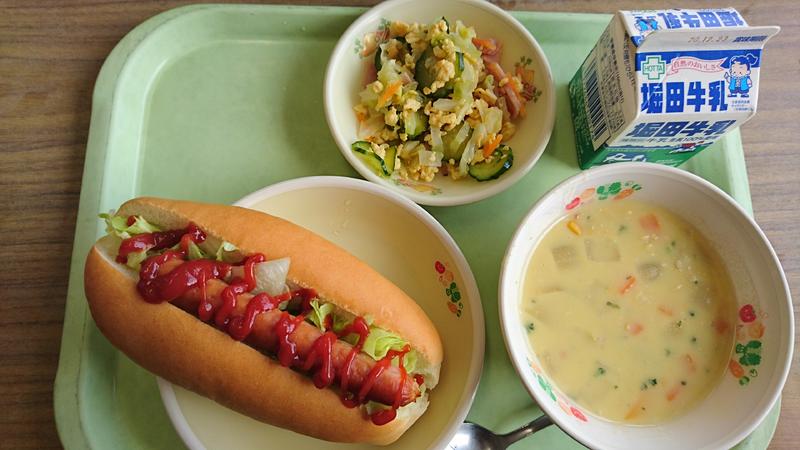 今日の献立は、ホットドッグ、コーンポタージュ、たまごサラダでした。ホットドッグはセルフでレタス、ウインナーをパンにはさんでケチャップをかけて食べました。大きな口を開けてかぶりつきながら食べていました。今日はとても寒い日でしたので、温かいコーンポタージュが体にしみました。