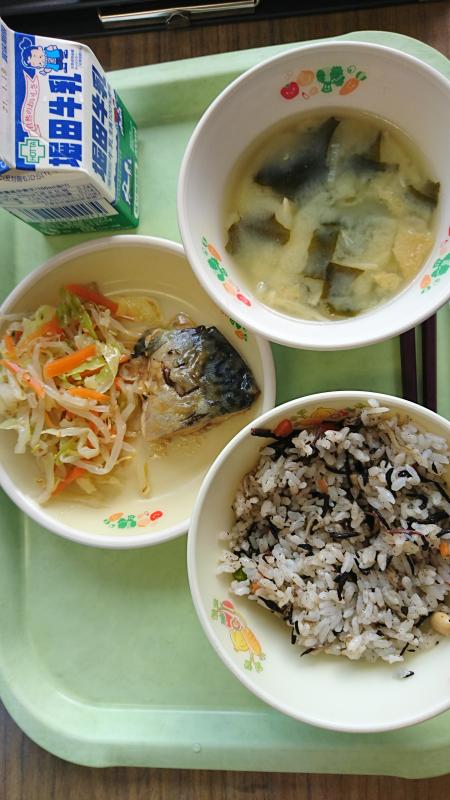 今日の献立は、カルシウムご飯、さばのゆずみそ煮、もやしのごまあえ、みそ汁でした。ごはんには、ひじき、大豆、ちりめんの3つのカルシウム食材が入ってます。ちりめんを入れることでうま味がぐっと増しておいしさがアップします。