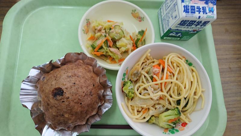 今日の献立は、チョコ蒸しパン、ちりめんパスタ、ツナサラダでした。蒸しパンはチョコチップやナッツがたっぷりで、子どもたちに大好評でした。パスタも以前ご紹介したおいしさの秘密「にんにくオリーブオイル」に今日は鷹の爪(赤唐辛子)も加えてペペロンチーノ風の味に仕上がりました。学校中にいい香りが漂います。
