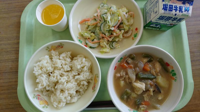今日の献立は、ビーフカレーと野菜炒めでした。今日は中学校が代日でお休みでしたので、いつものカレールーとは配合を変えて子ども向けのマイルドな甘口カレーにしました。
