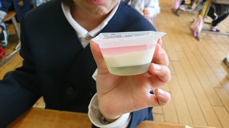 写真のデザートは、中学生への体育大会応援食「紅青ゼリー」です。下にいちごゼリー、上はカルピスとハワイアンブルーの氷みつで作ったゼリーで2層になってます。小学生は一週間後に!