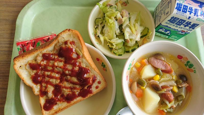 今日の献立は、バーガートースト、ポトフ、レタスサラダでした。バーガートーストは、食パンにハンバーグのたねを薄く塗り伸ばして焼いたものです。ハンバーグのたねが余ったらご家庭でもお試しください。子どもたちにも大好評&おかわり希望多数でした。