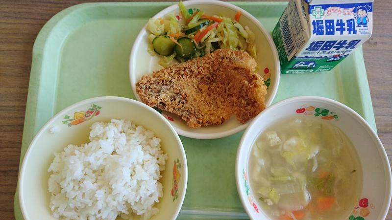 今日の献立は、ごはん、はものフライ、即席漬け、豚汁でした。はもは大矢野産の高級魚です。小骨が多い魚ですが、上天草漁協では「骨切り」の機械を使って処理され、食べやすい切り身で納めてくださいます。子どもたちからも大人気の魚メニューです。