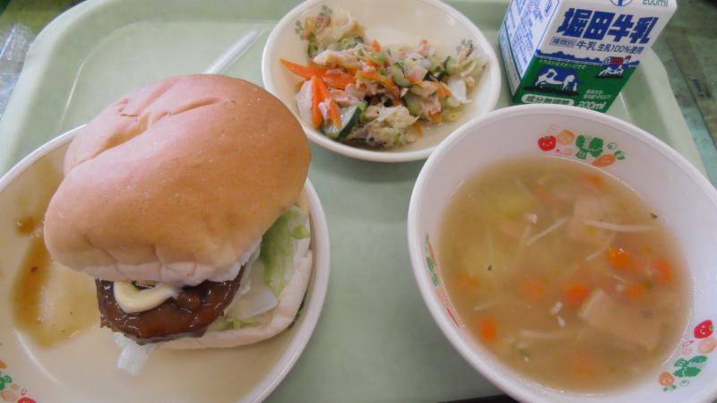 今日の献立は、照焼バーガー、ポテトスープ、ツナサラダでした。子どもたちの大好きな照焼バーガー。1年生の分は給食室で作り、2年生以上はセルフバーガーで自分ではさんでバーガーを作りました。1年生の子どもたちはパン箱のふたを開けた瞬間「うわぁー