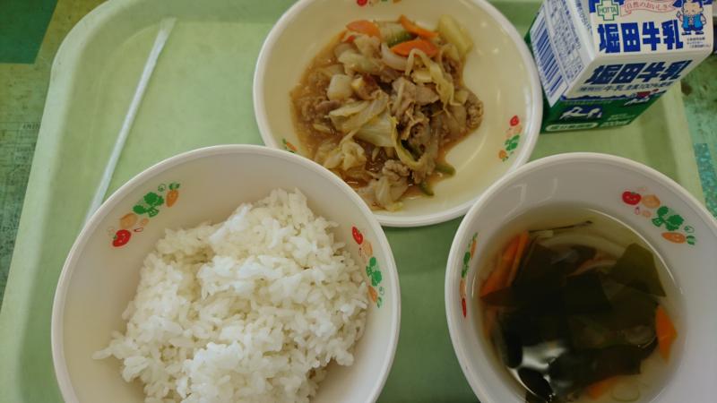 今日の献立は、ごはん、回鍋肉(回鍋肉)、わかめスープでした。回鍋肉の豚肉は大人気の「梅肉ポーク」でした。