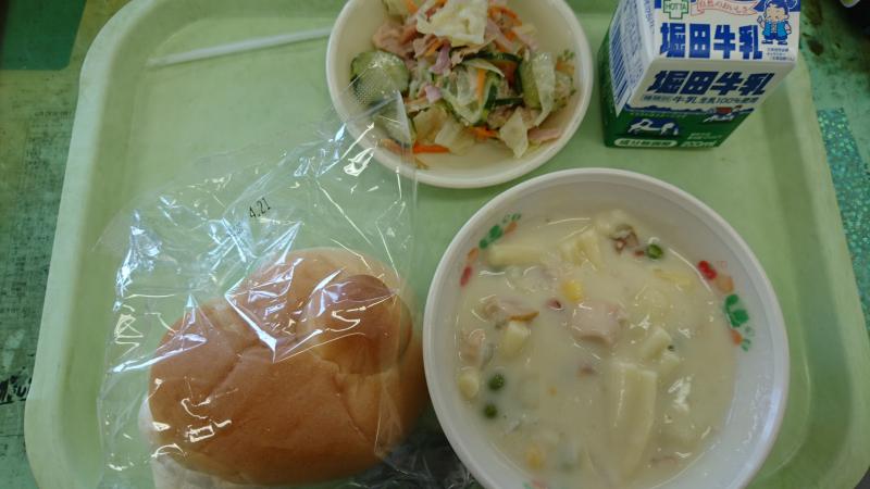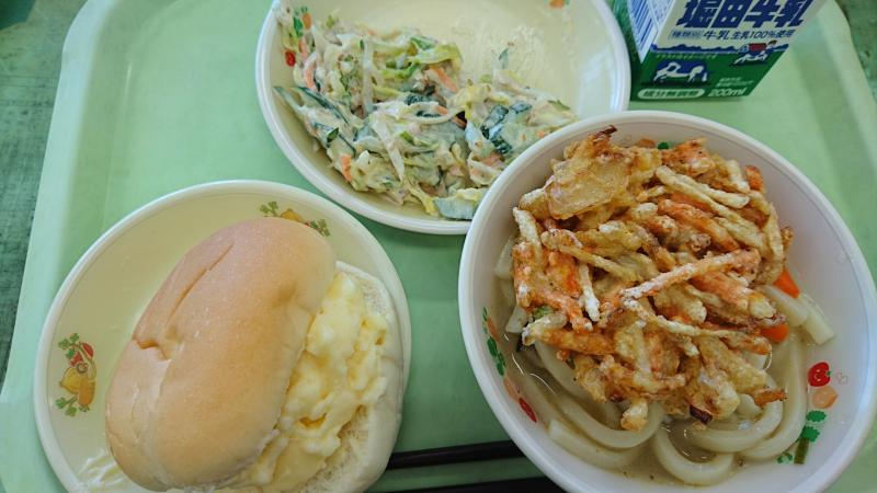 今日の献立は、手作りクリームパン、かき揚げうどん、ごぼうサラダでした。手作りのカスタードクリームは、卵黄、牛乳、砂糖、コーンスターチを中火で加熱しながらゆっくりと約20分間練り、とろみが出てきたら仕上げに溶かしバターと生クリームを入れて完成です。砂糖控えめの上品な甘さです。 旬の春ごぼうがおいしいシャキシャキのごぼうサラダは1年教室で余った分を、龍小一の食欲旺盛クラス5年生に持っていくと、おかわり希望の長蛇の列で瞬く間に売り切れました!