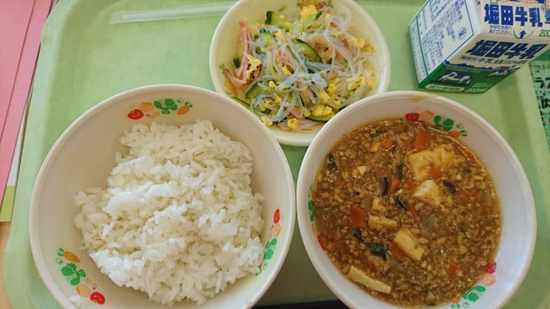 今日の献立は、麦ご飯、麻婆豆腐、バンサンスーでした。麻婆豆腐には、豚ひき肉だけでなく、ひき肉のように見せたひきわり大豆が入っています。豆は不足しがちな食材ですので、色々な形で摂取できるように工夫を心がけています。
