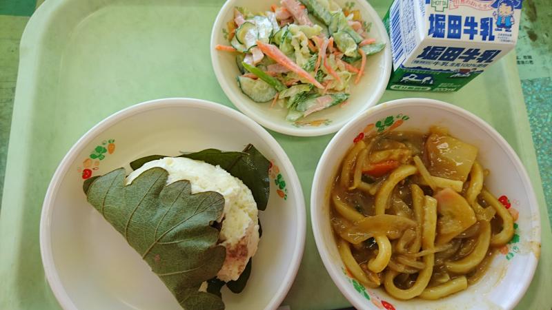 今日の献立は、かしわもち風蒸しパン、カレーうどん、アスパラサラダでした。一日遅れですが、端午の節句の行事食としてかしわもち風の虫パンを手作りしました。ミックス粉に牛乳を入れて、パン生地を作り、こしあんを包み込んで、柏葉を巻いて蒸します。柏葉は食べませんが、いい香りが蒸しパンに移っておいしく仕上がりました。(あんこが苦手な子どもたちがちらほら見られました。そういえば自分も子ども時代はあんこNG。。。でした(^0^;))
