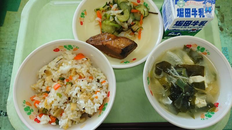 今日の献立は、竹の子ごはん、かつおの生姜煮、即席づけ、味噌汁でした。本日のピックアップ食材は、かつお。良質のたんぱく質が豊富で、鉄、ビタミンB12を含み、貧血予防にも役立ちます。旬の竹の子、味噌汁に入った生ワカメもとってもおいしかったです。