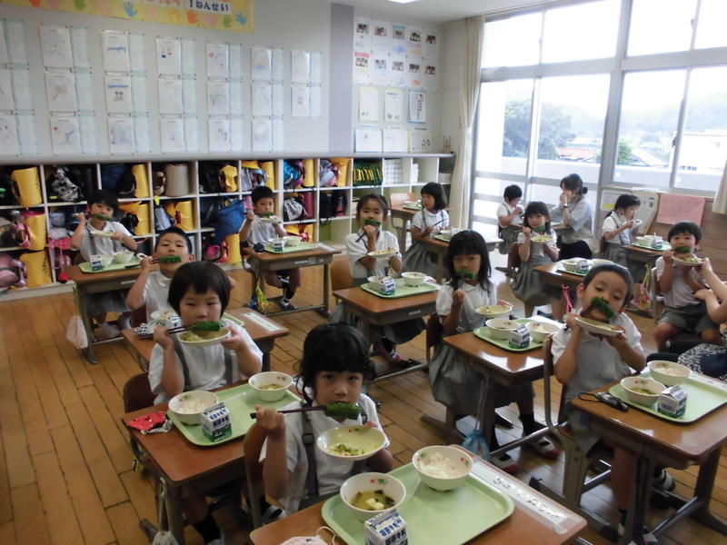熊本県産の冷凍みかんは、今日のような暑い日にはぴったりのメニューでした。給食時間1時間前に冷凍庫から冷蔵庫へ、そして20分前に冷蔵庫から取り出してワゴンに置いておきました。子どもたちの口に入る頃にはちょうどいい具合に、シャーベット状に溶けていました。冷たすぎて「知覚過敏で歯にしみます・・・」といった声が子どもたち、先生方からもちらほらと聞こえてきました。
