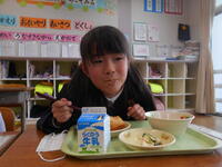今日は、1年生にとって記念日になったようです。はじめて揚げ(きなこ)パンを食べました。