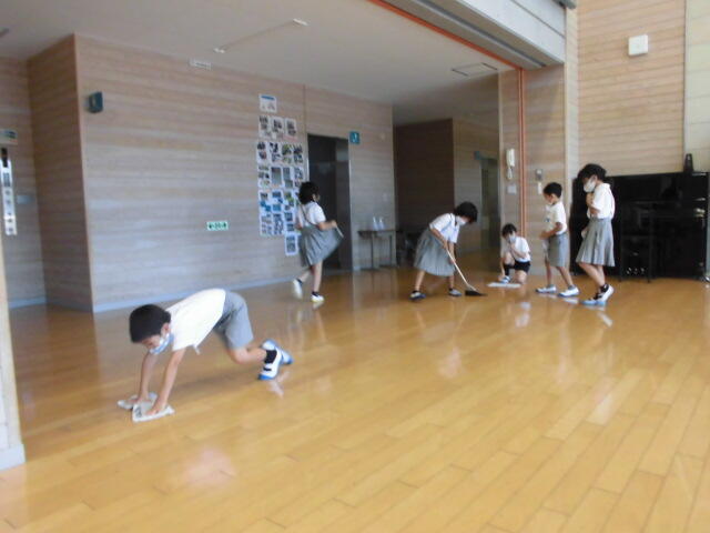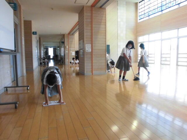 掃除の時間は、床をすみずみまで掃き、ピカピカにふきあげます。