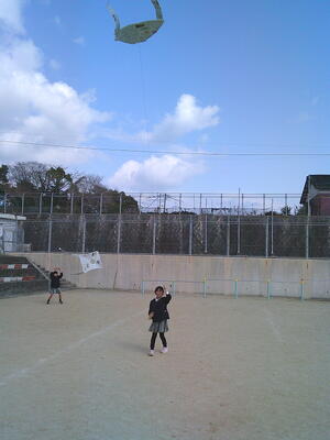 1・2年生が凧づくりにチャレンジしました。1年生と2年生がペアになって、新聞紙と竹ひごを使って凧をつくりました。凧ができたら、さっそく運動場に凧あげへ。風があり絶好の凧あげ日よりでした。子どもたちは走り回りながら、凧あげを楽しみました。凧あげのこつも少しずつつかんでいっていました。