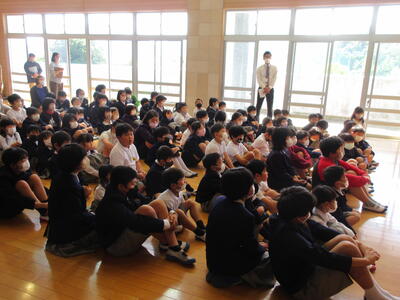 最後に、ホールで担当職員の話と校長先生からの話がありました。「お・か・し・も・ち」(押さない・かけない・しゃべらない・もどらない・近寄らない)の説明を聞いたり、防災クイズに答えたりして、正しい知識を改めて確認することができました。また、お家の方とも地震や津波の時にどこに避難するのか等の話をするようにも伝えられました。