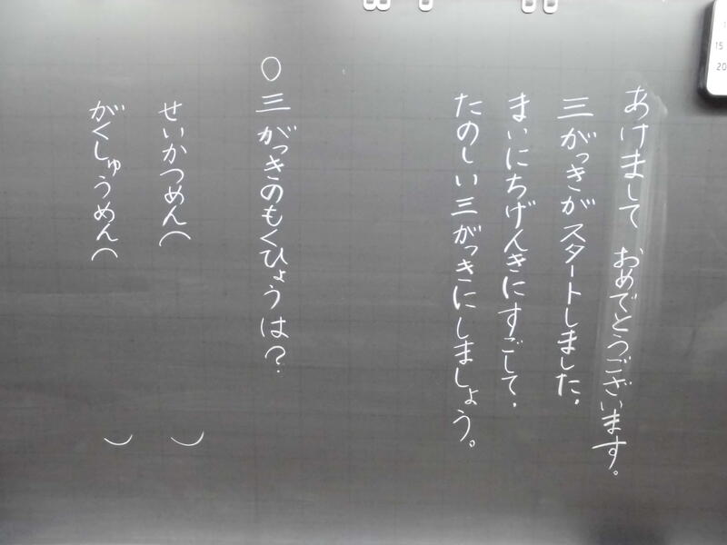 3学期最初の授業は、「始業式」です。校長先生から、校長先生から出された冬休みの宿題の確認や、3学期の目標となる漢字一文字「安」のお話がありました。