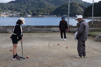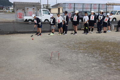 4年生は、先日行った高齢者疑似体験での学びをもとに、地域の方と「ゲートボール」で交流しました。スティックでのボールの打ち方やルールを教えてもらいながら、楽しく活動できました。「ゲートを通ったとき、とってもうれしかった。」という子どもたち。地域の皆さん、ありがとうございました。