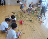 昼休みなどに、地域の方が持ってきてくださった笹に七夕の飾り付けを行っています。子どもたちは、思い思いの願い事を短冊に書いて笹に結びつけています。また、織姫と彦星、輪っかや吹き流しなどの飾りを地域の方にいただきましたので、きれいに飾ることができるよう気をつけて笹に結びつけました。七夕の日まで期間がありますので、まだ完成ではありませんが、短冊や飾りをつけた笹を立ててみました。その大きさや美しさに驚く子どもたちでした。地域の方にはこいのぼりに続き、年中行事へもご協力いただき、ありがとうございます。