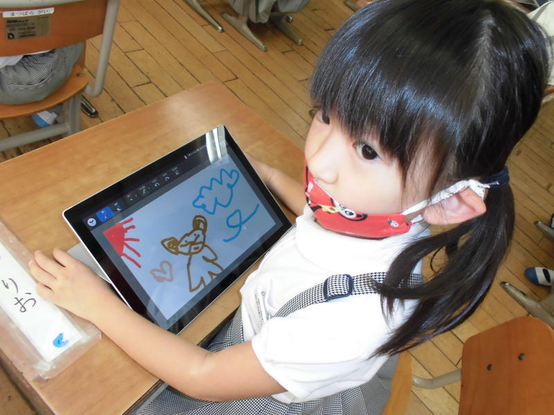 1年生は初めてのタブレットです。起動の仕方からシャットダウンの仕方等使い方を勉強しました。お絵かきも楽しみました。