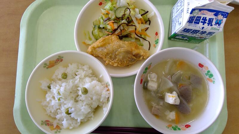 今日の献立は、グリンピースご飯、すけそうだらの天ぷら、即席漬け、豚汁でした。今日の目玉、旬のグリンピースご飯のグリンピースは、1年生が1時間目にさやむきをしてくれました。今年の1年生は10人と小数ですが、みんな器用にさやをむくことができ小中合わせて210人分のグリンピースを20分ほどでむきあげました。
