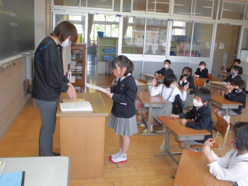 担任が、よかったところと次の学年でがんばることを説明をして渡します。