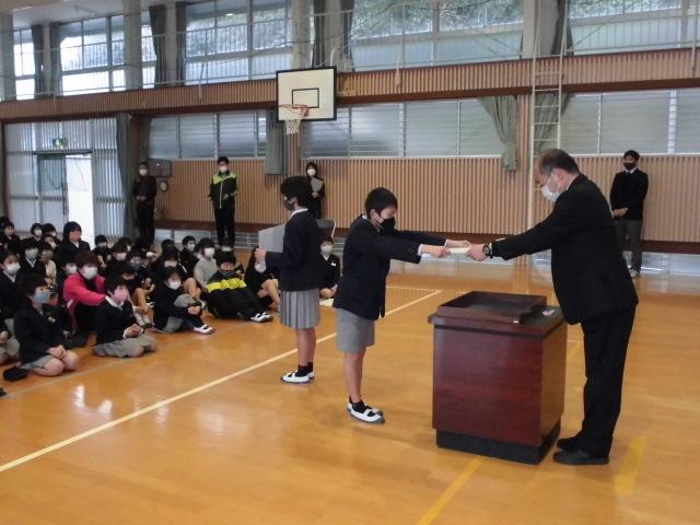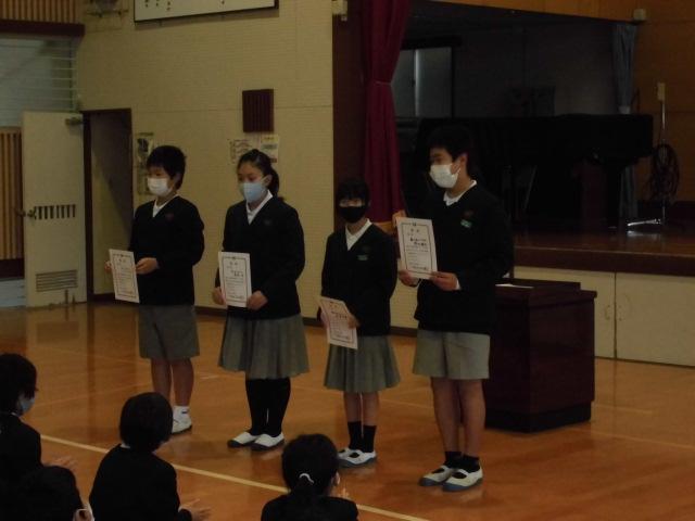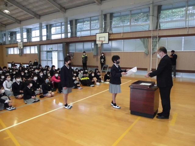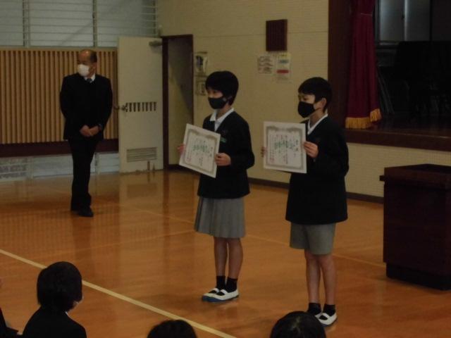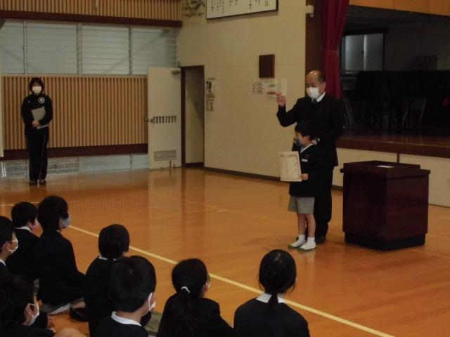 今日は全校集会がありました。11月に行われた「熊日学童スケッチ展」、11月から1月にかけて行われた「上天草市読書マラソン」、天草郡市小体連主催の長縄チャレンジの表彰がありました。