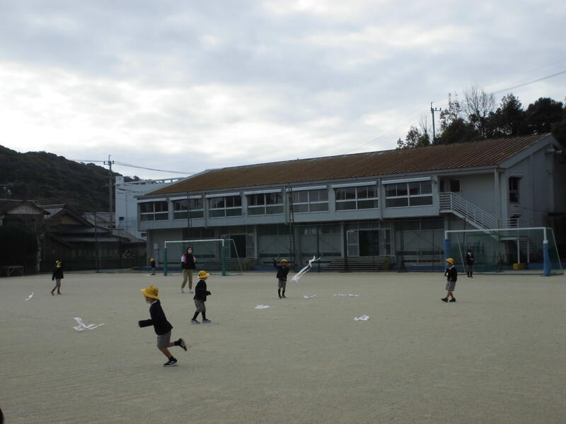 1年生は前回の紙だこから、ビニールだこへ。ビニールの方がよくあがったようです。