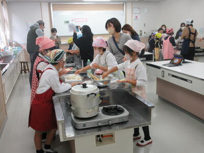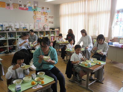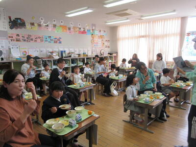 1年生の保護者の方に来ていただいての、給食試食会がありました。4月に入学してから、子ども達も更に成長し給食の準備も上手にできるようになっています。