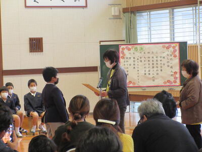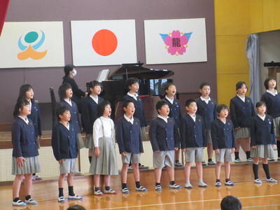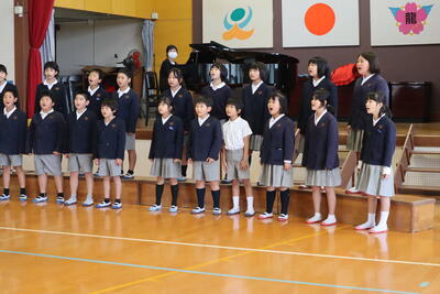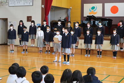 最後に、4年生からの誓いの言葉と合唱の発表をしました。先日の郡市音楽会で歌った「あなたにありがとう」を素敵な笑顔で歌うことができました。