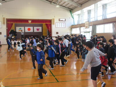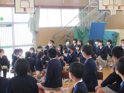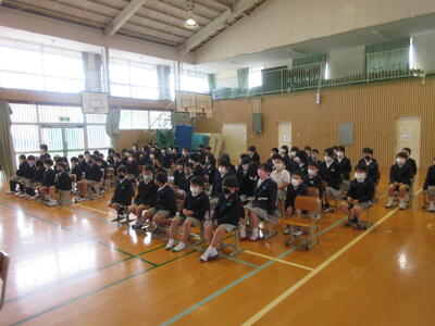 校長先生のお話です。各学年の頑張りに拍手をおくりました。これまで学校のリーダーとして頑張ってくれた6年生は明日卒業式です。