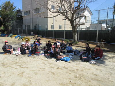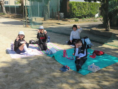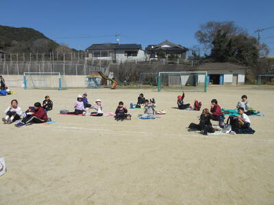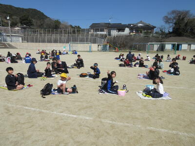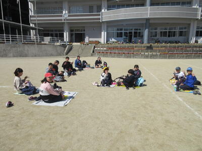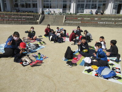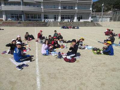 そして、お昼はお弁当タイム。運動場で縦割り班でおいしくいただきました。天気もよく、気持ちよかったようです。