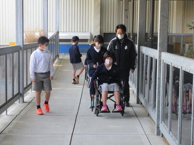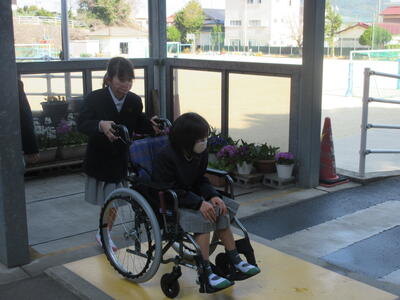車椅子体験では、エレベーターやスロープで実際に車椅子を使いました。車椅子の安全な操作の仕方や、後ろから押す人の声かけ等学ぶことができました。