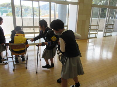 高齢者疑似体験では、装具を付けたり、視野が狭くなるゴーグルを付けたりして、歩いたり、階段の上り下りをしたり、本を読んだりしました。高齢者の方が困ってらっしゃったら、声をかけて色々な手伝いをしていきたいという気持ちも高まったようです。