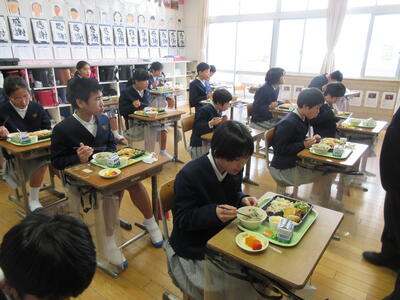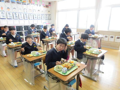 17日(金)に6年生のバイキング給食がありました。毎日、もりもり給食を食べている6年生。コロナ禍の為、子ども達が選択したものを容器につめて配膳されました。また、ご飯山盛りを頼んでいた人もいたようです。今日ももりもり食べていました。