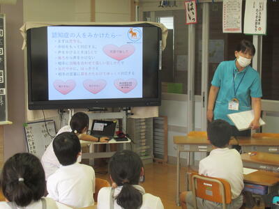 10月5日に4年生で認知症サポーター養成講座を行いました。社会福祉協議会から、瀬脇さんと東矢さんに来ていただきました。