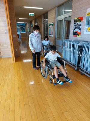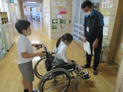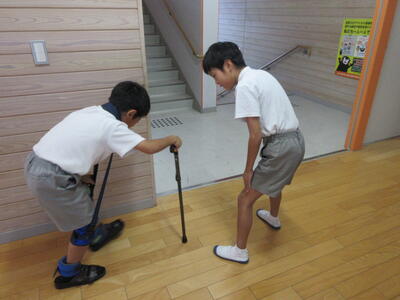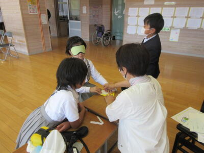 12日(月)に4年生が高齢者疑似体験を行いました。社会福祉協議会の皆さん、地域の民生委員さんに来ていただきました。