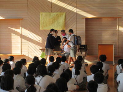 10日(月)に熊本県高校生平和活動に参加している高校生が、2名本校に来校し、修学旅行前の6年生に平和に関する講話をしてくださいました。