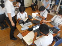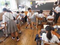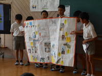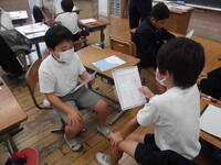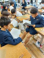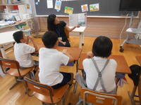 物語「たずねびと」を深く読み、全体像と感想を交流することに5年生がチャレンジしました。まず、物語を読んで全体像と初発の感想を交流しました。次に、場面ごとに内容を読み取りました。さらに、主人公の行動や会話、心情や情景の描写に着目しながら、主人公の心情の変化を図に表しながら考えました。さらに、主人公の気持ちを一番変えたものは何か考えました。子どもたちは自由に移動しながら考えを広げたり深めたりしていました。また、グループによる学び合いでは、子どもたちはたくさんの意見を出し合いながら共感したり納得したりしていました。今単元では、子どもたちは学習タブレットを使い、友だちの考えを参考にするなどしながら主体的に読みを深めました。子どもたちが積極的に学習する姿が目立っていました。