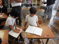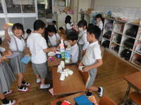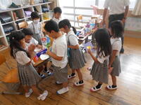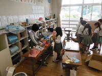 1年生のために、これまで一生懸命おもちゃをつくってきた2年生。8日は、いよいよ1年生を招待して「おもちゃランドで遊ぼう」を開催する日です。おもちゃランドにふさわしいいろいろなコーナーがありました。くじ引き、ホッケー、お店、修理屋、ゴール、レース&ベイブレード。どれも工夫いっぱいで心のこもったコーナーです。2年生は、1年生に遊び方について説明したり一緒に遊んで教えたりしながら、1年生が楽しめるようにがんばっていました。遊びに来た1年生は、お好みのコーナーを見つけながらいろいろなコーナーを笑顔いっぱいに回っていました。その様子を見た2年生もまた笑顔いっぱいになっていました。