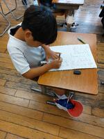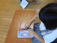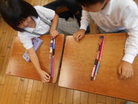 どちらが長いか考え、説明する学習を行いました。まず、赤と青の鉛筆の長さを比べました。子どもたちは、鉛筆を机に立ててみたり机の上で端をそろえてみたりしながら、長さを比べていました。その後、ペアで長い理由を説明し合ったのですが、上手でした。次は、ひもの長さを比べました。赤いひもは伸びた状態、青いひもは丸くなった状態のものを今度はペアで考え、比べ方や長い理由などを探りました。はじめは鉛筆の場合と同じように並べて比べていたのですが、他の方法はないか考え、ひもが鉛筆や消しゴムの何個分あるかで比べはじめるペアもいました。子どもたちは、具体物を操作しながら、とても楽しそうに考え、説明することができました。