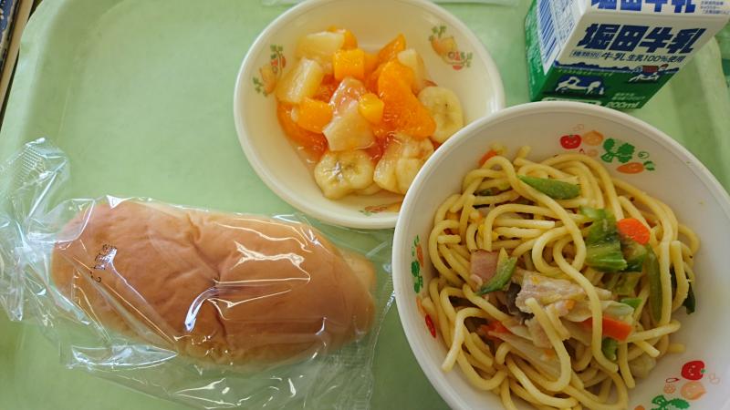 令和3年度のスタートです。今日の献立は、食パン、クリームゴールド、パリパリ焼きそば、焼き餃子、デコポンでした。